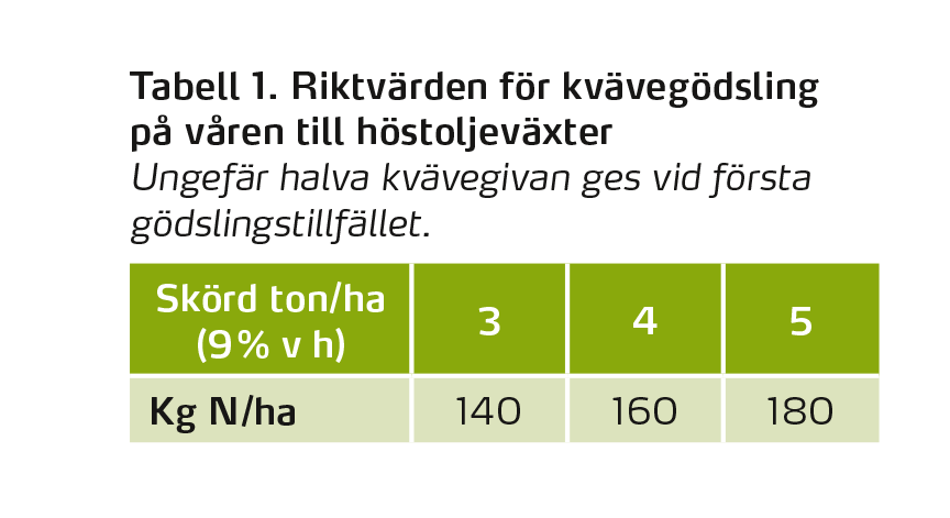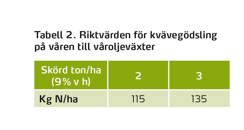 Kvävegivans storlek är beroende av förväntad skördenivå och markens egen förmåga att leverera kväve. Generella rekommendationer för vår-och höstoljeväxter finns i tabell 1 och 2.