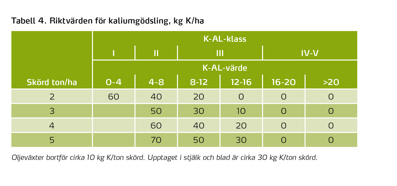 Oljeväxter bortför ca 10 kg K/ton. Upptaget i stjälk och blad är cirka 30 kg K/ton skörd.