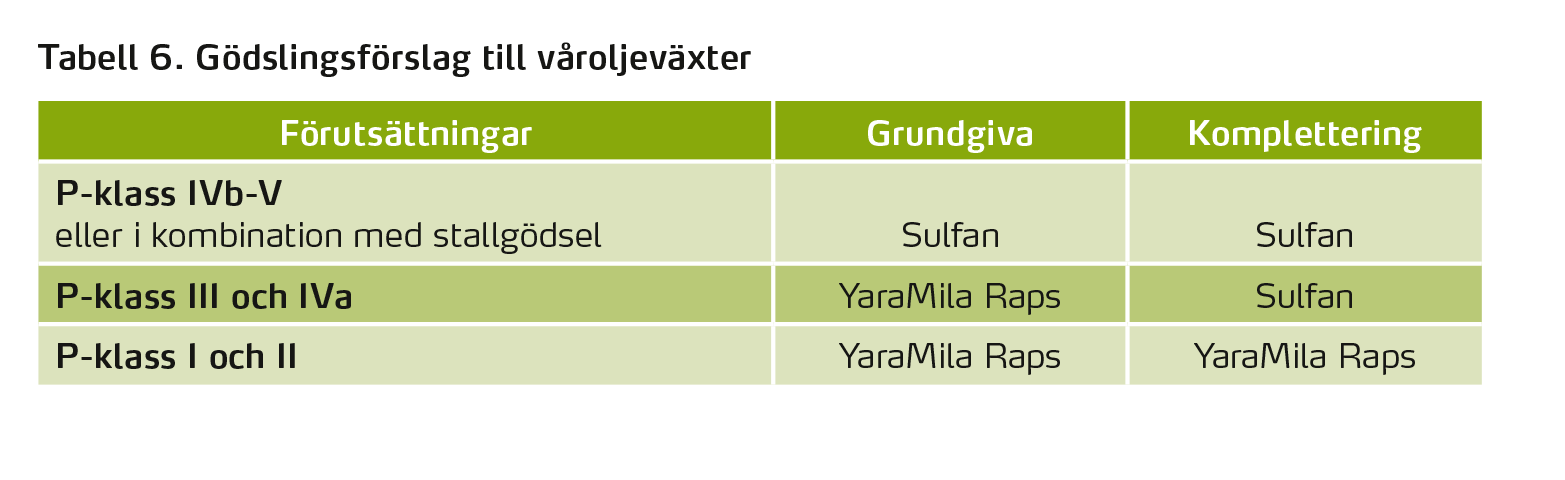 Våroljeväxter är, liksom höstoljeväxter, känsliga för låg fosfor- och kaliumtillgång. Därför är det ofta lönsamt att gödsla med dessa näringsämnen. Dessutom ska alltid svavel tillföras i samband med kvävegödslingen. Ett NPK-gödselmedel med hög svavelhalt är idealiskt, inte minst vid kombisådd. Använd YaraMila Raps i samband med sådd och komplettera med Sulfan då en bedömning av årets bestånd kan göras, se tabell 6. Utför inte kompletteringen alltför sent, framförallt om det finns risk för försommartorka.