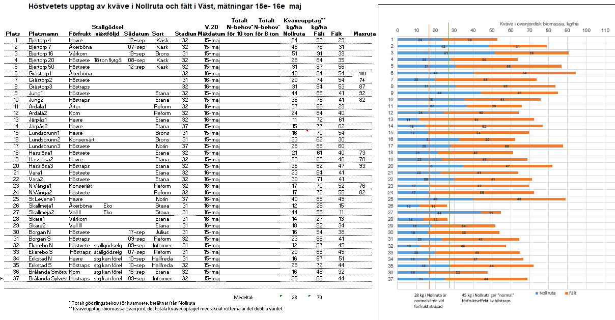 Fjelie N är ett tidigt utvecklat fält med både hög markleverans och högt N-upptag i det mineralgödslade fältet. Nollrutan har hitintills gett 42 kg N/ha och fältet runt omkring har tagit upp 94 kg N/ha. Båda värdena gäller för ovanjordisk biomassa vilket innebär att fältet av mineralkvävet tagit upp drygt 100 kg N/ha. Utvecklingsstadium vid mätningen var DC 37 (flaggbladet just synligt).