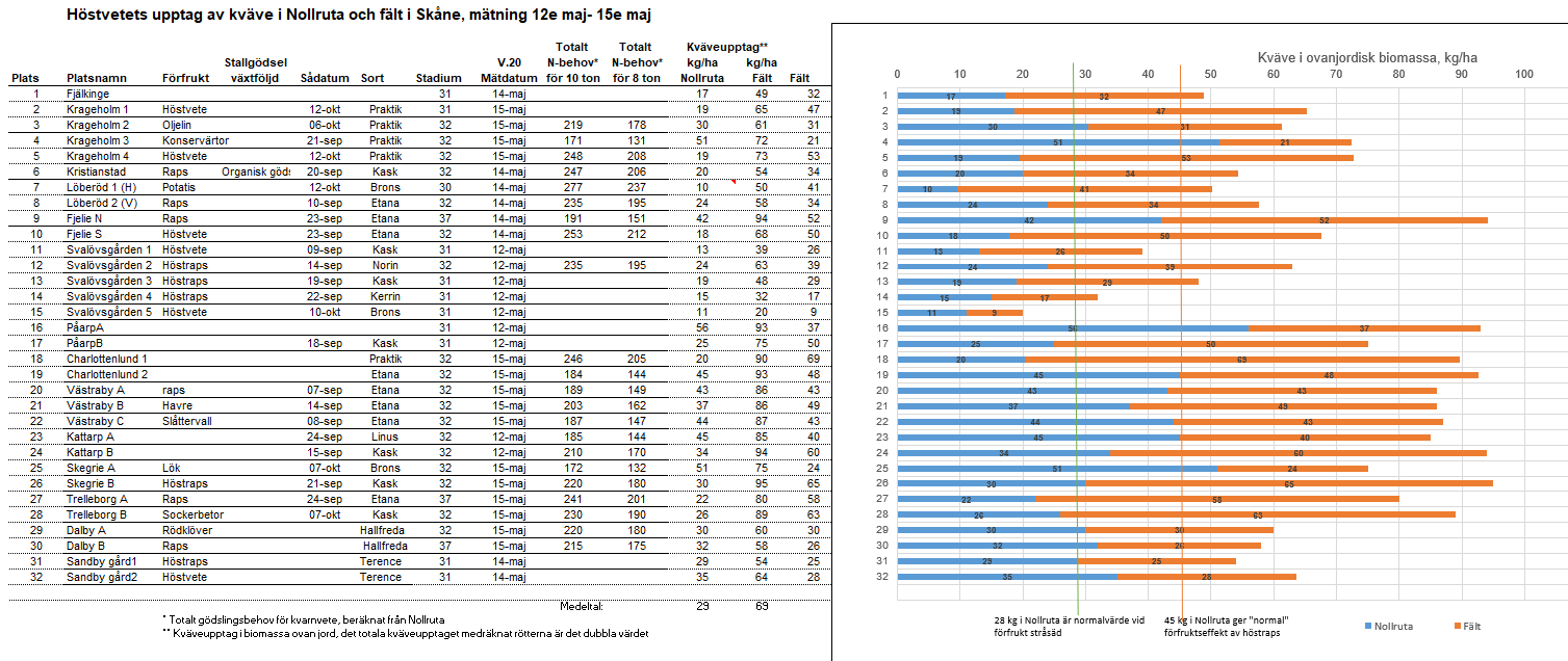 Nybble 1 är en nollruta med medelhög markleverans för området. Ovanjordiskt N-upptag i nollrutan 26 kg N/ha och i omgivande fält 107 kg N/ha. Plantorna var i DC 43 (flaggbladets slida börjar vidgas) vid mätningen.