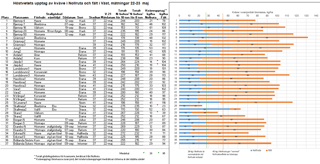 I område syd är nu de flesta fält i DC 37 (flaggladet just synligt) eller högre och det totala kväveupptaget i ovanjordisk biomassa ligger till stor del i spannet 70 – 110 kg N/ha. Räknar vi om detta till ett upptag med rötterna inkluderat, så innebär det att plantorna tagit upp 140 – 220 kg N/ha i hela plantan. Vi ser ett tydligt lägre kväveupptag i fält som inte fått en relevant mängd nederbörd efter mineralgödselspridningarna.